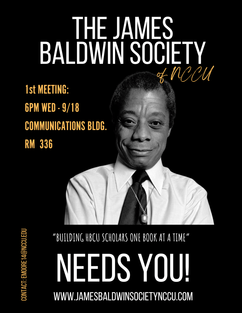 I’m super excited that we’re finally launching the James Baldwin Society of NCCU! 25 students signed up over the course of two days. Students are still interested in J. Baldwin’s legacy and that gets me pumped more than anything! We’ve crafted an expansive vision that allows for inter-institutional collaborations and community service while building Baldwin scholars one book at a time. I can’t wait until 9/18!